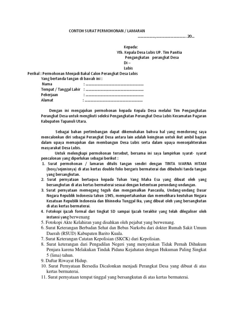 Contoh surat lamaran perangkat desa 2020 dalam pengisian seleksi penjaringan dan penyaringan jabatan perangkat desa salah satu syarat administrasi yang harus dilengkapi oleh bakal calon perangkat desa adalah surat lamaran surat permohonan.