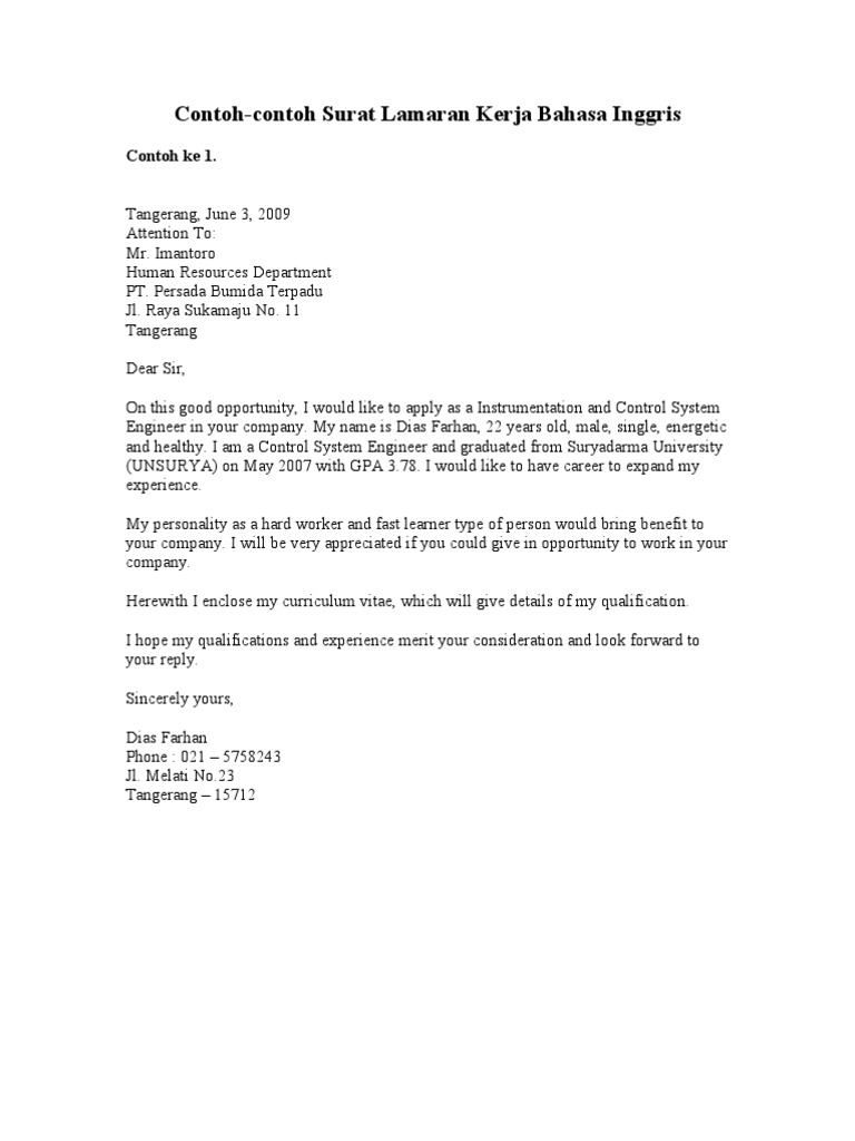 Contoh surat lamaran kerja dalam bahasa inggris call center officer. Menggunakan surat lamaran kerja dalam bahasa inggris adalah sebuah nilai tambah, karena itu membuktikan kecakapan anda dalam berbahasa inggris via tulisan. Contoh surat lamaran kerja dalam bahasa inggris. Berikut adalah beberapa contoh surat lamaran via email sebagai bahan referensi untuk anda. Tentu karena statusnya sebagai front door, maka surat lamaran. Jaka jamin contoh surat lamaran pekerjaan via email ini tidak langsung ditolak oleh hrd. So, i hope you will freely see my cv or to contact my email in : Banyak perusahaan yang mencari kandidat dengan kemampuan tersebut. Selain itu, saya juga bisa berbicara bahasa inggris dengan cukup baik. Nah, untuk lebih jelasnya berikut ini kami berikan contoh surat lamaran kerja via email yang dapat anda jadikan referensi. Surat lamaran kerja memberi anda kesempatan untuk menunjukkan kualifikasi dan pengalaman anda yang berhubungan dengan pekerjaan, memperkuat. Dokumen seperti surat lamaran atau cover letter adalah hal yang paling pertama dilihat oleh hrd ketika menyeleksi calon karyawan baru. Kendala tersebut adalah body email lamaran kerja, terutama jika menggunakan bahasa inggris.