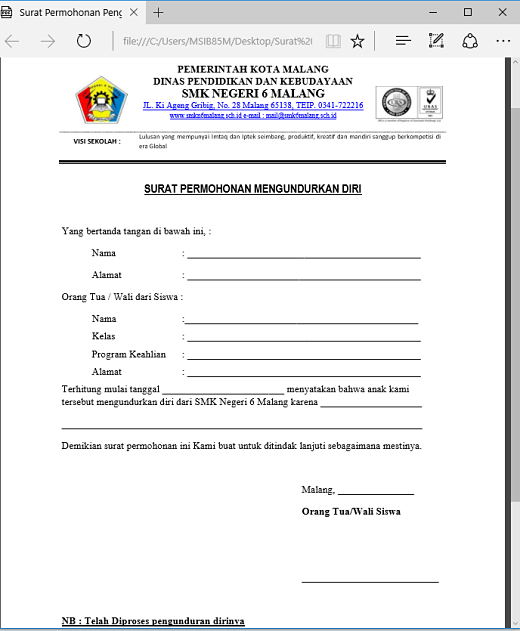 Mengajukan pengunduran diri anak saya tersebut di atas dari nama sma/smk dengan alasan: